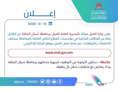تعلن وزارة العمل ممثلة بالمديرية العامة للعمل بمحافظة شمال الباطنة عن توفر فرص وظيفية في مؤسسات القطاع الخاص العاملة بالمحافظة لمختلف التخصصات والمؤهلات.