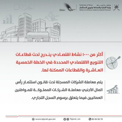 يتم معاملة الشركات المسجلة تحت قانون استثمار رأس المال الأجنبي معاملة الشركات المملوكة للمواطنين العُمانيين، فيما يتعلق برسوم السجل التجاري عند الاستثمار في أحد الأنشطة الاقتصادية المدرجة في قطاعات التنويع الاقتصادي.