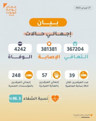 وهج الخليج_ مسقط أعلنت وزارة الصحة عن تسجيل 1763 إصابة جديدة بفيروس كورونا خلال 3 أيام الماضية (الخميس، الجمعة، السبت).