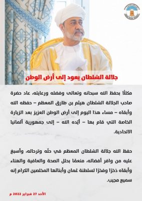 مكللاً بحفظ الله سبحانه وتعالى وفضله ورعايته، حضرة صاحب الجلالة السُّلطان هيثم بن طارق المُعظم -حفظه الله ورعاه- يعود إلى أرض الوطن العزيز بعد زيارة خاصة قام بها جلالته إلى جمهورية ألمانيا الاتحادية استغرقت عدة أيام.