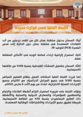 وهج الخليج_ مسقط أصدرت اللجنة العليا المكلفة ببحث آلية التعامل مع التطورات الناتجة عن انتشار فيروس كورونا المستجد(كوفيد 19) عدة قرارات جديدة