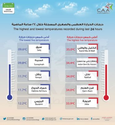 حيث أوضحت الأرصاد أن “سيق” تواصل تسجيل أدنى درجة حرارة في سلطنة عمان فيما سجلت أعلى درجة حرارة في الكامل والوافي وبلغت 35.0C درجة سيليزية. .
