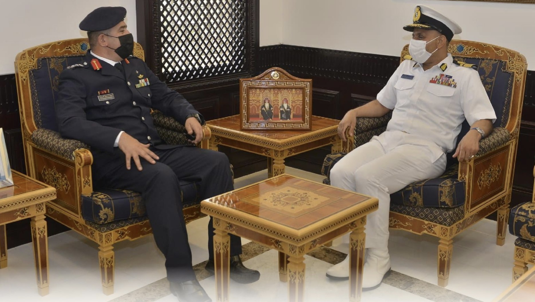 استقبل اللـواء الركـن بـحـري سـيف بـن نـاصـر الـرحـبـي قـائـد البـحـريـة السلطانية العمانية بمكتبـه العقيد الركـن (مهنـدس) محمـد إسماعيل الطراونـة قـائـد قـوة الـواجـب المختلطـة (١٥١) والـوفـد العسكري المرافـق لـه الذي يزور سلطنة عمان حالياً.