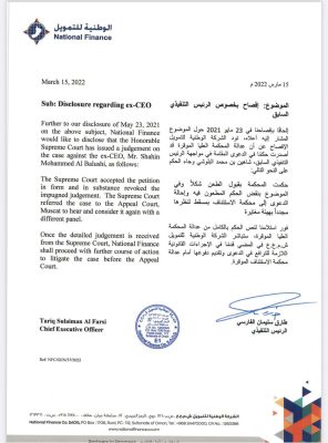 أفصحت الشركة الوطنية للتمويل اليوم الأربعاء بأنه إلحاقاً بإفصاحنا السابق في 23 مايو المنصرم حول الرئيس التنفيذي السابق نود التوضيح أن عدالة المحكمة العليا قد أصدرت حكما في الدعوى المقدمة في مواجهة الرئيس التنفيذي السابق شاهين بن محمد البلوشي وجاء الحكم على النحو التالي: حكمت المحكمة بقبول الحكم المطعون فيه وإحالة الدعوى لمحكمة الاستئناف بمسقط لنظرها مجددا بهيئة مغايرة.