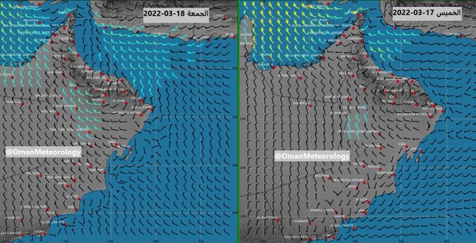 نبهت الأرصاد الجوية العمانية من هبوب رياح شمالية غربية معتدلة إلى نشطة على معظم المحافظات خلال اليومين القادمين تؤدي لتصاعد الغبار في المناطق الصحراوية والمكشوفة و ارتفاع موج البحر (متوسط/هائج 2.0-2.5 متر) على سواحل بحر عمان وسواحل محافظة مسندم.
