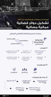 مجلس الشؤون الإدارية للقضاء يصدر قراراً بتشكيل 3 دوائر قضائية عمالية مسائية في محافظة مسقط ضمن مبادرات تحسين النظام القضائي العمالي أولوية التشريع والقضاء والرقابة بالتعاون والشراكة مع وزارة العمل ووحدة متابعة تنفيذ رؤية عمان 2040.
