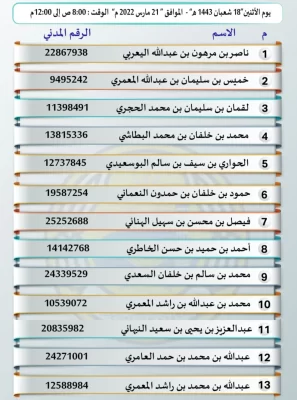 أعلنت وزارة الأوقاف والشؤون الدينية بالتنسيق مع وزارة العمل المواطنين المبينة أسماؤهم أدناه، والذين اجتازوا المقابلات العلمية لشغل وظيفة ” إمام وخطيب” المعلن عنها على ضوء إعلان الشواغر الصادرة من وزارة العمل رقم (2021/7) تنفيذًا للتوجيهات السامية لمولانا حضرة صاحب الجلالة السلطان هيثم بن طارق المعظم -حفظه الله ورعاه-.
