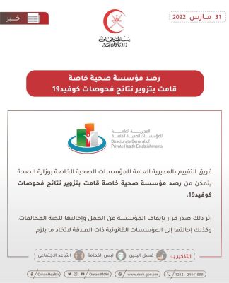 وهج الخليج_ مسقط فريق التقييم بالمديرية العامة للمؤسسات الصحية الخاصة بوزارة الصحة يتمكن من رصد مؤسسة صحية خاصة قامت بتزوير نتائج فحوصات كوفيد١٩