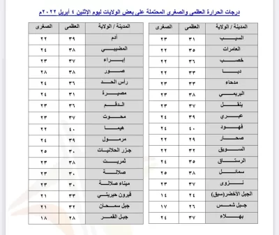 وتهب على سواحل بحر عمان رياح شمالية إلى شمالية شرقية خفيفة إلى معتدلة وتهب على بقية المحافظات رياح جنوبية إلى جنوبية شرقية خفيفة إلى معتدلة وتكون نشطة أحيانا على سواحل بحر العرب.