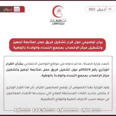أصدرت وزارة الصحة بيان توضيحي حول ماتم تداوله بشأن تشكيل فريق عمل لمتابعة تجهيز و تشغيل مركز الإخصاب بمجمع النساء والولادة بالوطية.