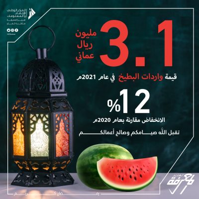 وهج الخليج - مسقط   أعلن مركز الوطني للإحصاء والمعلومات عن قيمة واردات البطيخ لعام 2021م في سلطنة عمان، والذي بلغ قيمته 3.1 مليون ريال عماني، مشكلاً إنخفاض بنسبة 12% مقارنتًا بعام 2020م