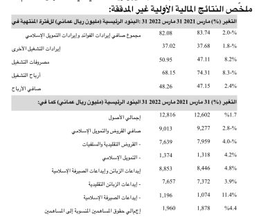 1) بلغ صافـي إيـرادات الفـوائد من الأعمال المصرفية التقليدية وإيرادات التمويل الإسلامي (82.08) مليون ريال عماني للثلاثة أشهر المنتهية في 31 مارس 2022م مقارنة بمبلغ (83.74) مليون ريال عماني للفترة ذاتها من العام 2021م، أي بانخفاض نسبته (%2.0) و ذلك بسبب ارتفاع مصروفات الفوائد.