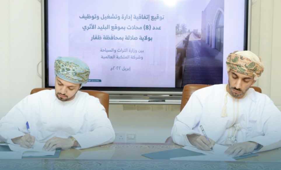 وقعت وزارة التراث والسياحة، اتفاقية إدارة وتشغيل وتوظيف مجموعة من المحلات بموقع البليد الأثري، مع شركة الملكية العالمية، وقع الاتفاقية من جانب الوزارة سعادة المهندس إبراهيم بن سعيد بن خلف الخروصي وكيل وزارة التراث والسياحة للتراث.