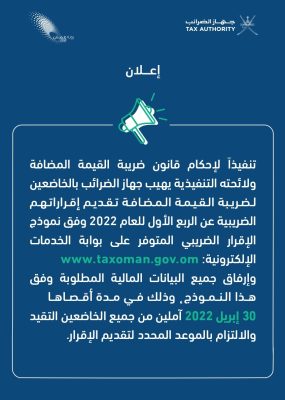 وهج الخليج- مسقط أصدر جهاز الضرائب إعلانًا لجميع الخاضعين للضريبة لمزيد من التفاصيل عبر المرفق التالي: