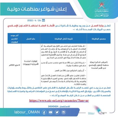 وهج الخليج - مسقط تعلن #وزارة_العمل عن وجود وظيفة شاغرة لدى الأمانة العامة لمنظمة التعاون الإسلامي حسب البيانات المحددة للتسجيل يُرجى استخدام الرابط التالي: 🔻 oic-oci.org/vacancies/?lan…