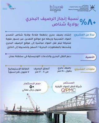بلغت نسبة الإنجاز في الأعمال الإنشائية لمشروع الرصيف البحري بخطمة ملاحة بولاية شناص حوالي 80 بالمائة حتى نهاية مارس 2022م ومن المتوقع بدء التشغيل التجريبي للمشروع في الربع الأخير من العام الجاري.
