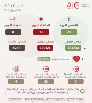 أعلنت وزارة الصحة عن تسجيل 13 إصابة جديدة بفيروس كورونا وصفر وفيات وتعافي 28 حالة خلال 24 ساعة الماضية.
