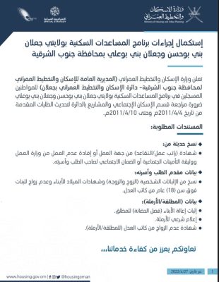 إعلان للمسجلين في برنامج المساعدات السكنية بمحافظة جنوب الشرقية