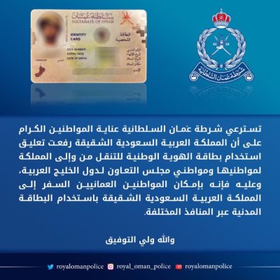 قالت شرطة عمان السلطانية عبر حسابها الرسمي في موقع ” تويتر” أن المملكة العربية السعودية الشقيقة رفع تعليق استخدام بطاقة الهوية الوطنية للتنقل من وإلى المملكة لمواطنيها ومواطني مجلس التعاون لدول الخليج العربية