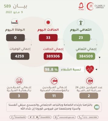 وأوضحت الوزارة أن إجمالي عدد الحالات المسجلة بفيروس كورونا “كوفيد19” في السلطنة 389306 إصابة ، و بلغ إجمالي الوفيات 4259 وفاة ، بينما بلغ إجمالي المتعافين 384509 شخص.