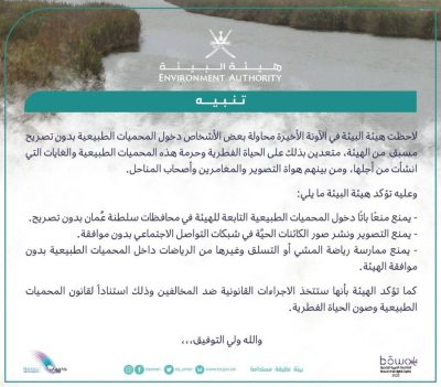 وهج الخليج- مسقط نبهت هيئة البيئة حول دخول المحميات الطبيعية بدون تصريح مسبق، وهو ما يعد مخالفة صريحة لقانون المحميات الطبيعية وصون الأحياء الفطرية.