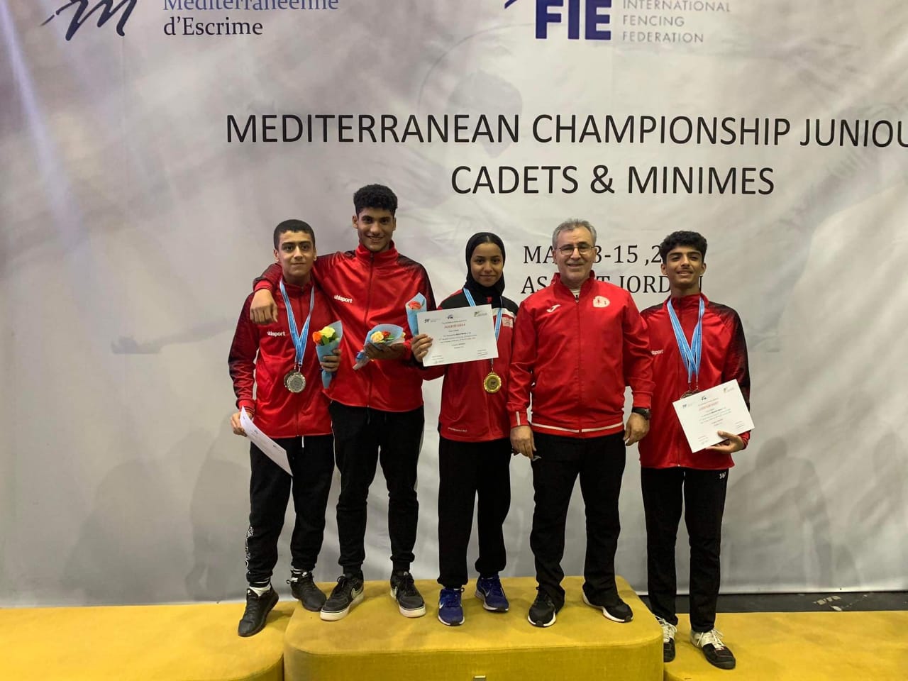 وفازت إسراء السيابي بطلة البحر الأبيض المتوسط بالأردن فلوريه تحت 15 سنة، وحقق أحمد كسكاس ميدالية فضية فلوريه و برنزية الايبه تحت 15 سنة، ونال سعيد الشعيبي ميدالية برنزية فلوريه و برنزية الايبه.