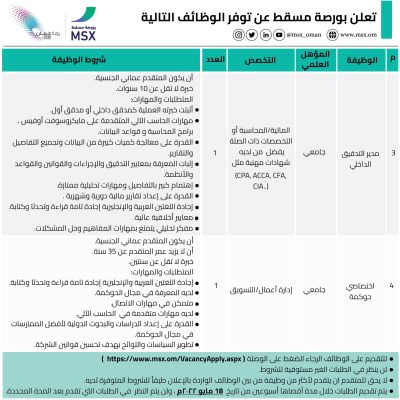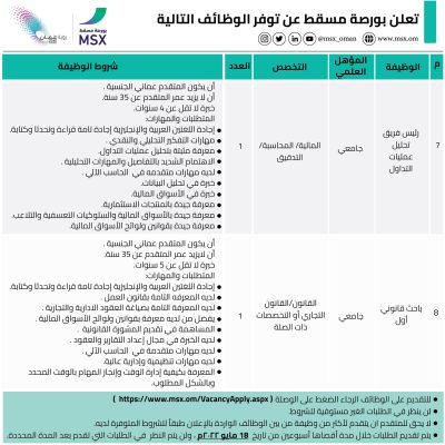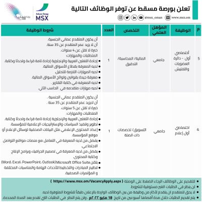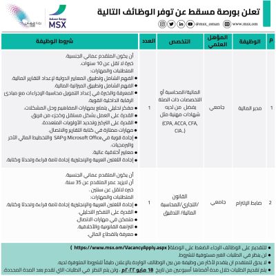 أعلنت شركة بورصة مسقط عن توفر الفرص الوظيفية أدناه: