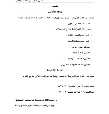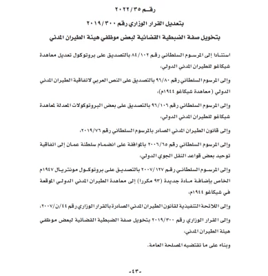 أصدرت وزارة العدل والشؤون القانونية القرار الوزاري رقم 35 لسنة 2022 بتعديل القرار الوزاري رقم 300 لسنة 2019 بتخويل صفة الضبطية القضائية لبعض موظفي هيئة الطيران المدني