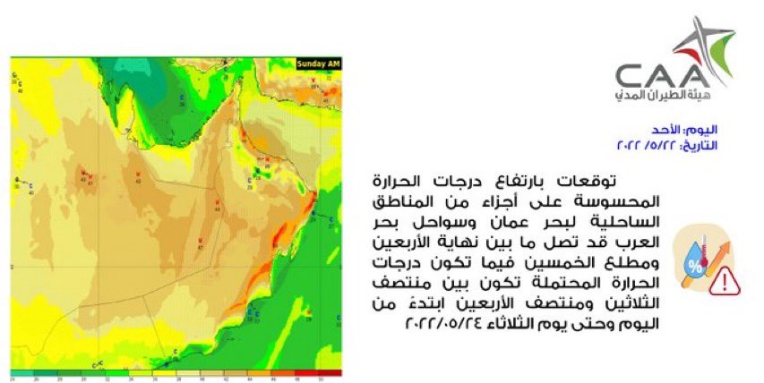 قالت الأرصاد العُمانية أن ابتداء من اليوم وحتى الثلاثاء توقعات بارتفاع درجات الحرارة المحسوسة على أجزاء من المناطق الساحلية لبحر عمان وسواحل بحر العرب قد تصل ما بين نهاية الأربعين ومطلع الخمسين.