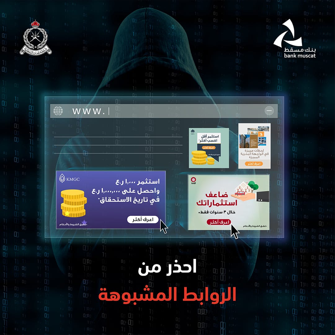 أعلنت شرطة عمان السلطانية وبنك مسقط عن استمرار التعاون والشراكة في تنفيذ الحملة التوعوية ضد جرائم الاحتيال الإلكتروني المالي للعام الثالث على التوالي تحت شعار “مسؤليتنا كلنا” وذلك بعد النجاح الكبير والتفاعل والإشادة من قبل فئات المجتمع لما لها من أهمية في تعزيز الوعي بهذه النوع من الجرائم والمطالبة في الاستمرارية بتنفيذ مثل هذه الحملات، ويأتي استمرار تنفيذ هذه الحملة التوعية المشتركة بين المؤسستين تماشيًا مع جهودهما في مجال المسؤولية الاجتماعية وتثقيف الجمهور العام للتعرف على الممارسات الاحتيالية المحتمله وما يرافقها من استغلال للأوضاع الراهنة لا سيما في أعقاب تفشي جائحة كوفيد-19، حيث واصل المحتالون في جميع أنحاء العالم ابتكار طرق جديدة للاحتيال على الناس مستغلين إقبال الناس على استخدام الإنترنت في شراء مختلف المستلزمات وأيضا عقد الصفقات التجارية.