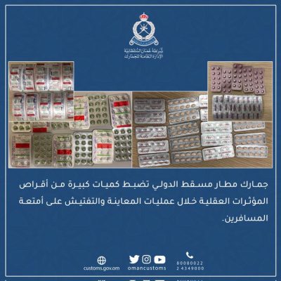 وهج الخليج- مسقط جمارك مطار مسقط الدولي تضبط كميات كبيرة من أقراص المؤثرات العقلية خلال عمليات المعاينة والتفتيش على أمتعة المسافرين .