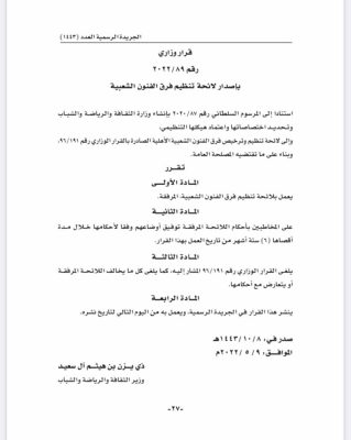أصدر صاحب السمو السيد ذي يزن بن هيثم وزير الثقافة والرياضة والشباب قرارا وزاريا رقم 89 / 2022 بإصدار لائحة تنظيم فرق الفنون الشعبية.