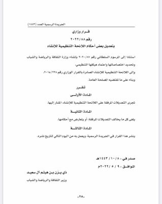 كما أصدر صاحب السمو السيد ذي يزن بن هيثم وزير الثقافة والرياضة والشباب قرارا وزاريا رقم 88 لسنة 2022 بتعديل بعض أحكام اللائحة التنظيمية للإنشاد.