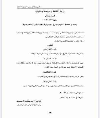 أصدر سمو السيد ذي يزن بن هيثم وزير الثقافة والرياضة والشباب القرار الوزاري رقم 87 لسنة 2022، بإصدار لائحة تنظيم الفرق الموسيقية الغنائية والاستعراضية.