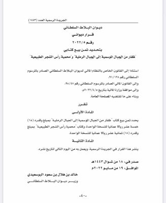 أصدر وزير ديوان البلاط السلطاني معالي السيد خالد بن هلال بن سعودي البوسعيدي، قرارا ديوانيا رقم 5 لسنة 2022 بتحديد ثمن بيع كتابي “ظفار من الجبال الموسمية إلى الجبال الرملية” و”محمية رأس الشجر الطبيعية”.