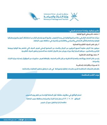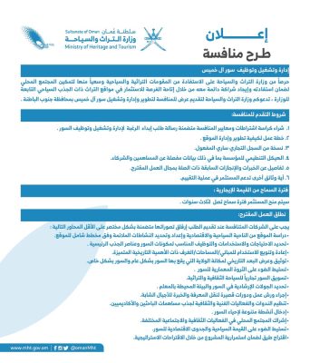أعلنت وزارة التراث والسياحة طرح منافسة لتطوير وإدارة وتشغيل سور آل خميس بمحافظة جنوب الباطنة.