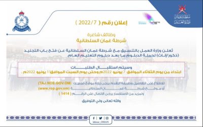 تعلن وزارةالعمل بالتنسيق مع شرطة عمان السلطانية عن فتح باب التجنيد (ذكور/إناث) لحملة الدبلوم ما بعد دبلوم التعليم العام.