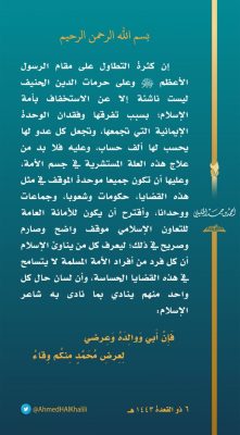 نشر الحساب الرسمي لسماحة الشيخ أحمد بن حمد الخليلي المفتي العام لسلطنة عُمان تغريدةً جاء فيها:”إن كثرة التطاول على مقام الرسول الأعظم ﷺ وعلى حرمات الدين الحنيف ليست ناشئة إلا عن الاستخفاف بأمة الإسلام؛ بسبب تفرقها وفقدان الوحدة الإيمانية التي تجمعها، وتجعل كل عدو لها يحسب لها ألف حساب، وعليه فلا بد من علاج هذه العلة المستشرية في جسم الأمة”.