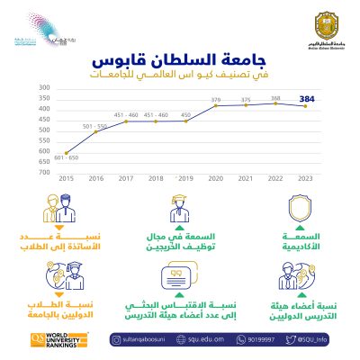 وهج الخليج - مسقط حصلت جامعة السلطان قابوس على المرتبة الـ 384 لعام 2023م ضمن مقياس تقييم الجامعات العالمية (كيو إس).
