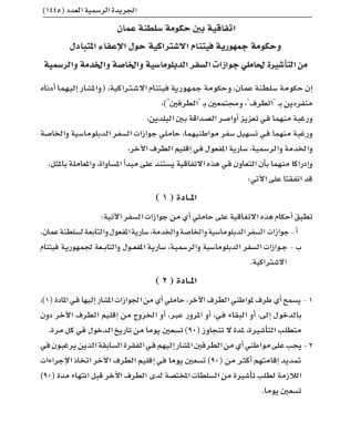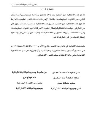 نشر في الجريدة الرسمية تفاصيل المرسوم السلطاني رقم ٣٣/٢٠٢٢ بالتصديق على اتفاقية بين حكومة سلطنة عمان وحكومة جمهورية فيتنام الاشتراكية حول الإعفاء المتبادل من التأشيرة لحاملي جوازات السفر الدبلوماسية والخاصة والخدمة والرسمية، الموقعة في مدينة هانوي بتاريخ 28 من أبريل 2022م.