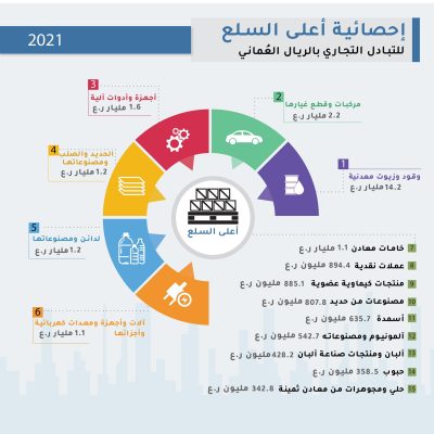 جاء الوقود والزيوت المعدنية كأعلى السلع قيمة في مجال التبادل التجاري بين سلطنة عمان ودول العالم بمقدار 14.2 مليار ريال عماني، تلتها المركبات وقطع الغيار، ثم الأجهزة والأدوات الآلية، ولمزيد من التفاصيل إليكم الانفوجرافيك أدناه.