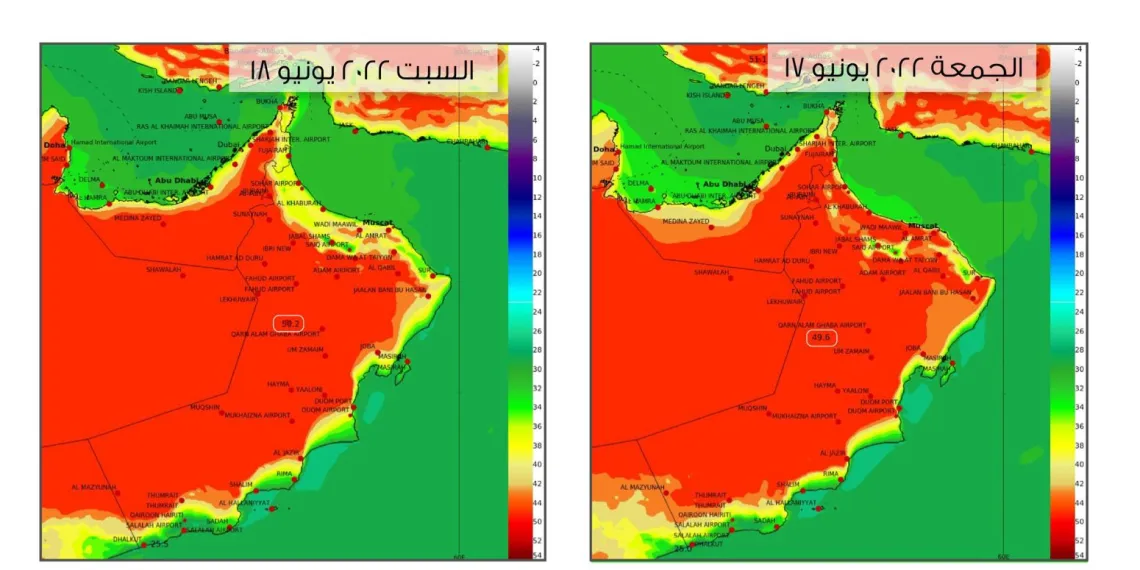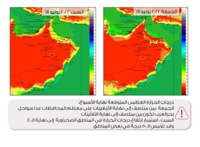 قالت الأرصاد العمانية عبر حسابها الرسمي في منصة تويتر بأن التوقعات تشير إلى ارتفاع درجات الحرارة العظمى يوم الغد لتصل بين منتصف ونهاية الأربعينات في معظم المحافظات خصوصًا المناطق الصحراوية.