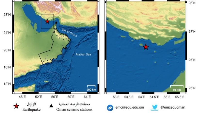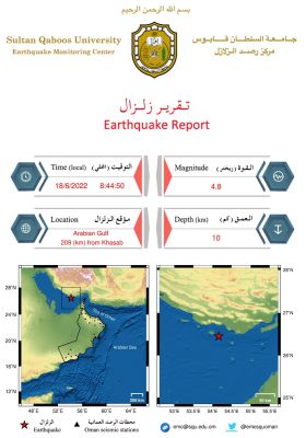 أعلن مركز رصد الزلازل بجامعة السلطان قابوس عن رصد زلزال  بقوة 4.8 درجة على مقياس ريختر في الخليج العربي، وذلك في تمام الساعة 8:44 مساء اليوم السبت بالتوقيت المحلي.