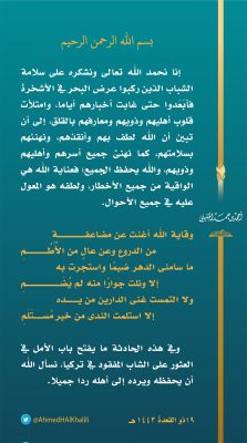 علَّق سماحة الشيخ أحمد بن حمد الخليلي المفتي العام لسلطنة عُمان عبر حسابه في “تويتر” بشأن العثور على المواطنَين العمانيَين المفقودين في البحر وكتب “إنا نحمد الله تعالى ونشكره على سلامة الشباب الذين ركبوا عرض البحر في الأشخرة فأبعدوا حتى غابت أخبارهم أياما، إلى أن تبين أن الله لطف بهم وأنقذهم، وفي هذه الحادثة ما يفتح باب الأمل في العثور على الشاب المفقود في تركيا، نسأل الله أن يحفظه ويرده إلى أهله ردًا جميلا، والله يحفظ الجميع”.