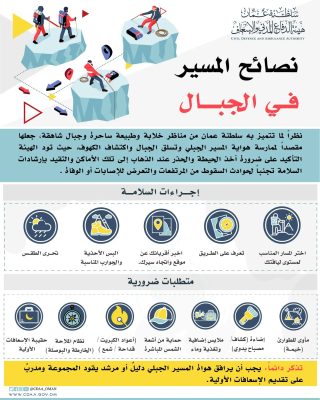 وتهيب هيئة الدفاع المدني والإسعاف بهواة المسير الجبلي إلى أخذ الاحتياطات اللازمة قبل الذهاب إلى الأماكن ذات التضاريس الجبلية ، تجنباً للمخاطر.