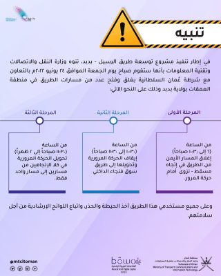 نبَّهت وزارة النقل والاتصالات وتقنية المعلومات بأنها ستقوم صباح غدٍ الجمعة بالتعاون مع شرطة عمان السلطانية بغلق وفتح عدد من مسارات ‎ طريق “الرسيل – بدبد” بمنطقة العمقات بولاية بدبد على النحو الموضح بالمرفق.