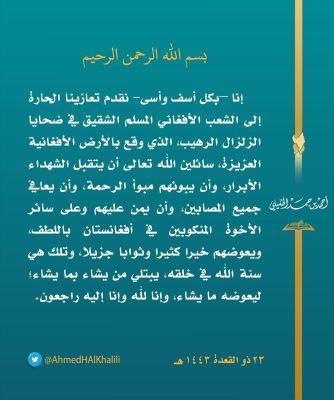 قدَّم سماحة الشيخ أحمد الخليلي المفتي العام لسلطنة عُمان تعازيه الحارة للشعب الأفغاني جراء الزلزال المدمر الذي ضرب جنوب شرق أفغانستان يوم أمس، وكتب عبر حسابه في تويتر: إنا بكل أسف وأسى نقدم تعازينا الحارة إلى الشعب الأفغاني المسلم الشقيق في ضحايا الزلزال الرهيب، الذي وقع بالأرض الأفغانية العزيزة سائلين الله تعالى أن يتقبل الشهداء الأبرار وأن يبوئهم مبوأ الرحمة وأن يعافي جميع المصابين، وأن يمن عليهم وعلى سائر الأخوة المنكوبين في أفغانستان باللطف.