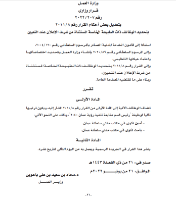 أصدر معالي محاد بن سعيد باعوين قرارا وزاريا رقم 207 لسنة 2022 بتعديل بعض أحكام القرار رقم 8 لسنة 2011 بتحديد الوظائف ذات الطبيعة الخاصة المستثناة من شرط الإعلام عند التعيين.