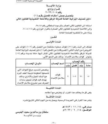 وهج الخليج- مسقط أصدر معالي سلطان بن سالم الحبسي وزير المالية، قرارا وزاريا بتعديل بعض أحكام الملحق رقم 1 دليل تصنيف الميزانية العامة للدولة، المرفق باللائحة التنفيذية للقانون المالي.