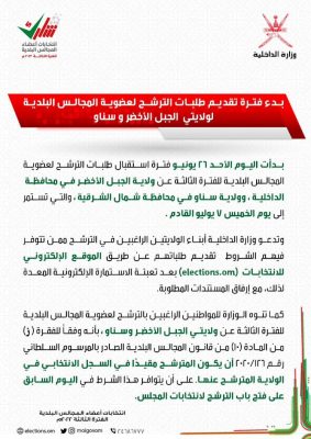 بدأت اليوم الأحد 26 يونيو فترة استقبال طلبات الترشح لعضوية المجالس البلدية للفترة الثالثة عن ولاية الجبل الأخضر، وولاية سناو ، والتي تستمر إلى يوم الخميس 7 يوليو القادم .